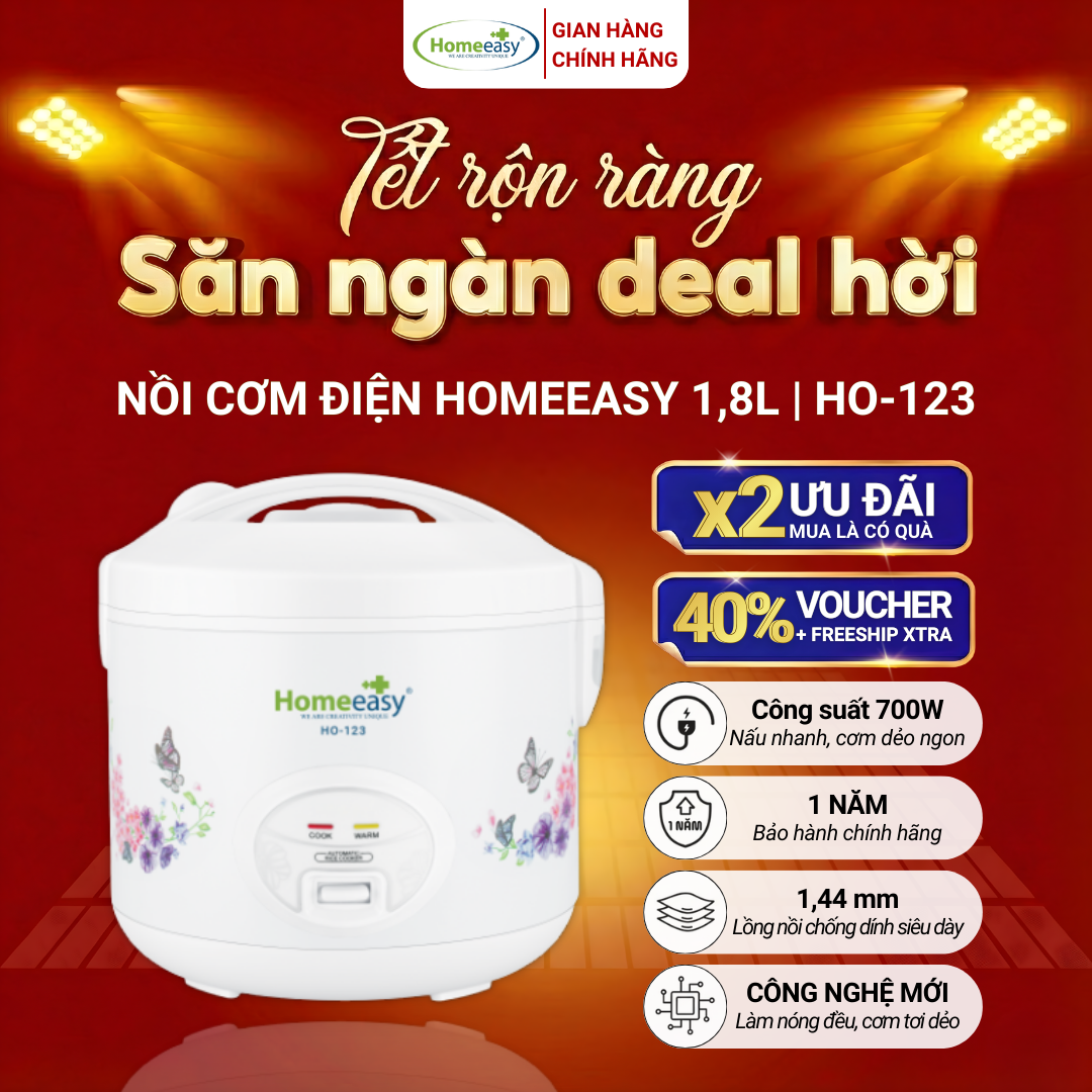 Nồi cơm điện Homeeasy HO-123 1.8L chính hãng. Lòng nồi siêu dày 1.4mm phủ chống dính cao cấp, giúp cơm chín đều, tơi xốp, hoàn toàn không bám đáy. Bảo hành 12 tháng.