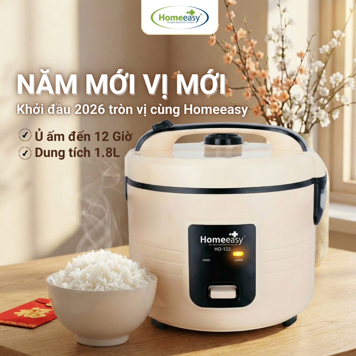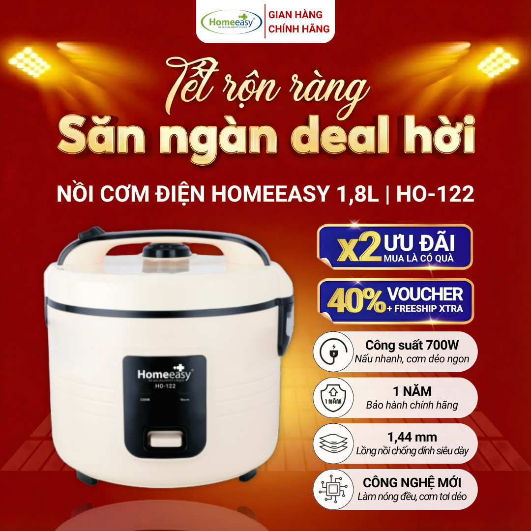 Nồi cơm điện Homeeasy HO-122 1.8L chính hãng. Lòng nồi siêu dày 1.4mm phủ chống dính cao cấp, giúp cơm chín đều, tơi xốp, hoàn toàn không bám đáy. Bảo hành 12 tháng.