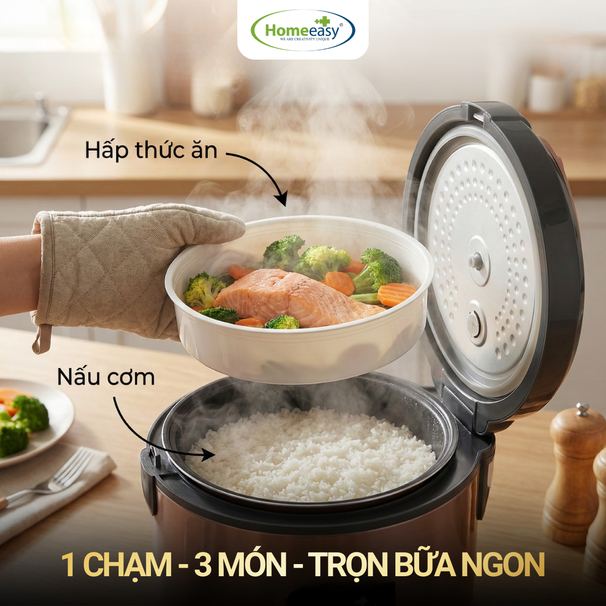 • Đa chức năng tiện dụng: Đi kèm xửng hấp tiện lợi, giúp bạn dễ dàng kết hợp hấp rau củ, bánh bao trong lúc nấu cơm, tiết kiệm tối đa thời gian vào bếp.