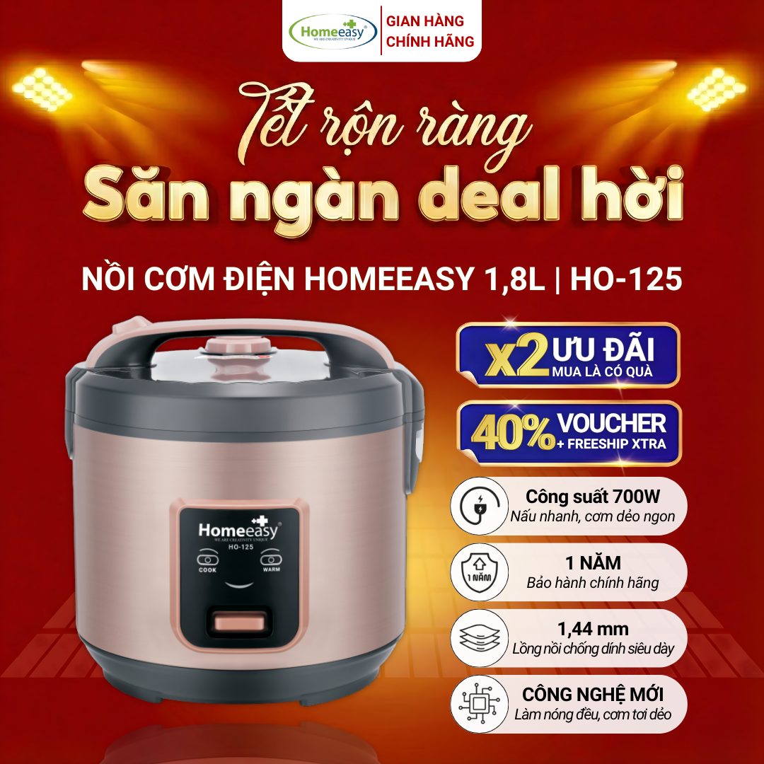 Nồi cơm điện Homeeasy HO-125 1.8L chính hãng. Lòng nồi siêu dày 1.4mm phủ chống dính cao cấp, giúp cơm chín đều, tơi xốp, hoàn toàn không bám đáy. Bảo hành 12 tháng.